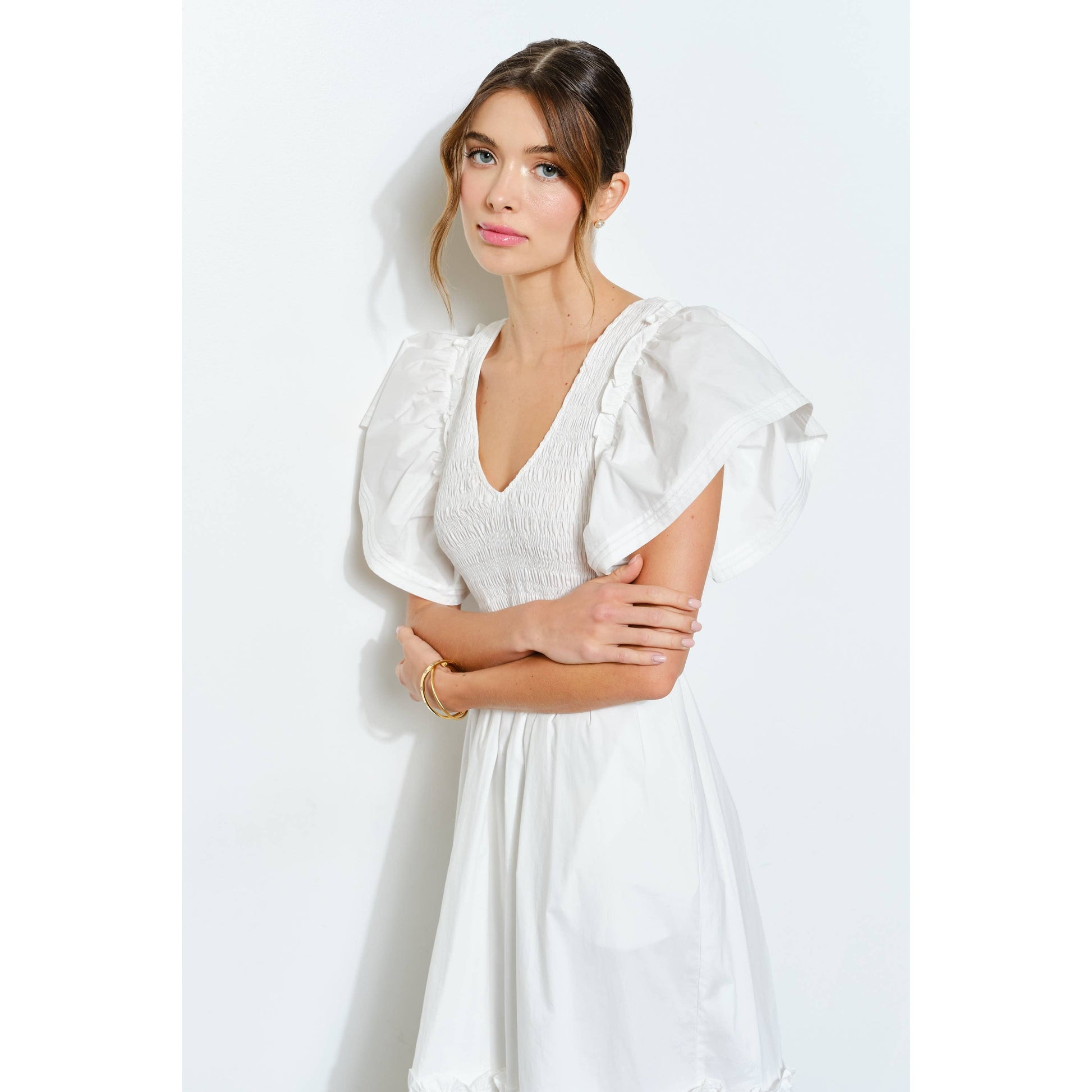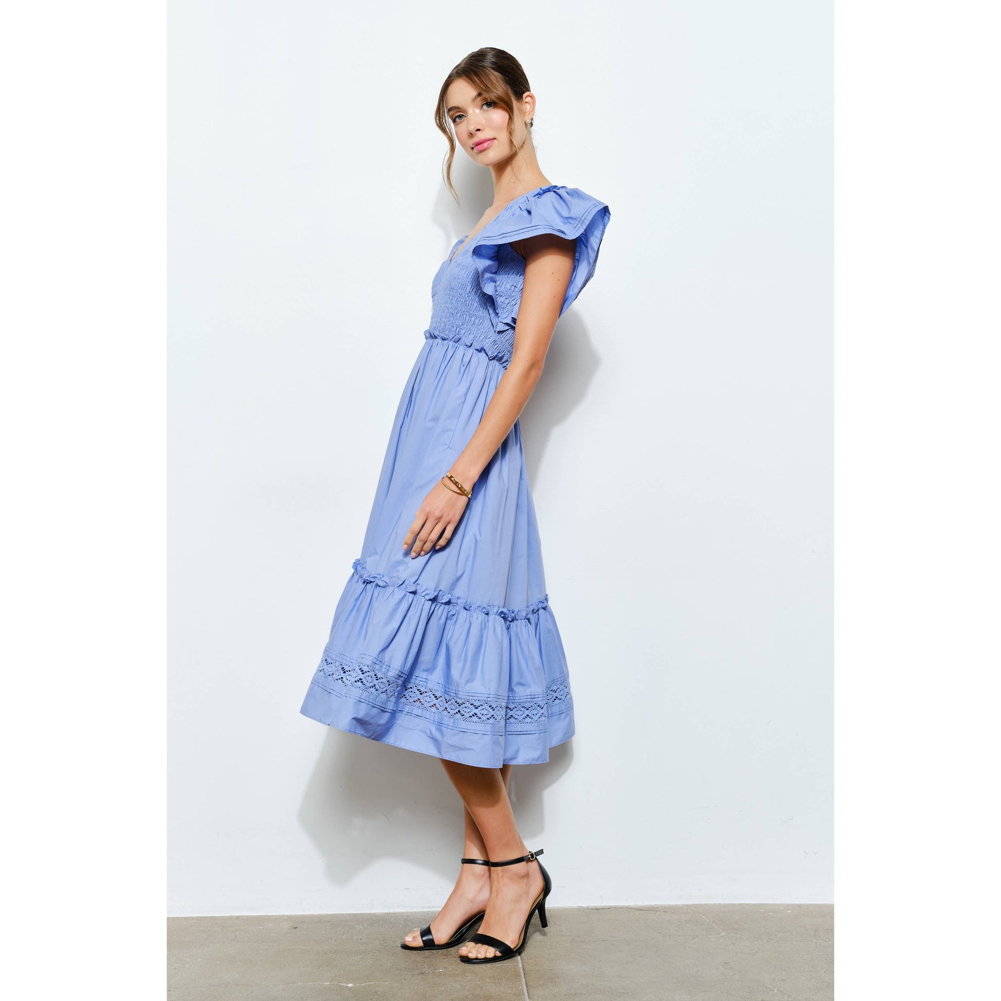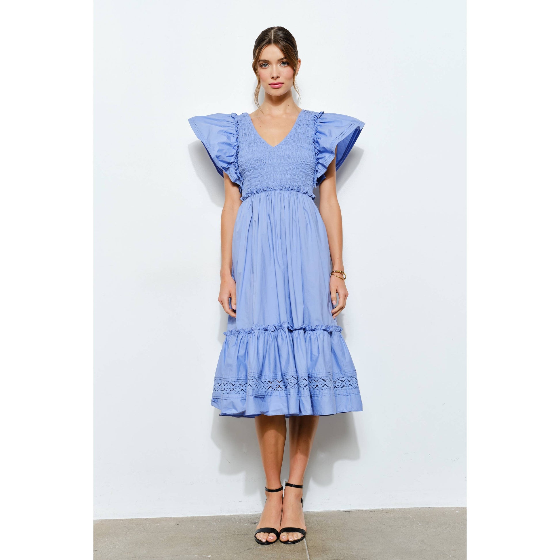 Ruffle Sleeve Smocked Cotton Midi Dress -Smocked bodice for a flattering, flexible fit -Feminine ruffle cap sleeves with playful movement -Deep V-neckline for an effortlessly chic look -Tiered skirt with eyelet lace trim adds texture and charm -Convenient side pockets for everyday ease -Perfect for warm-weather brunches, garden parties, or vacations
