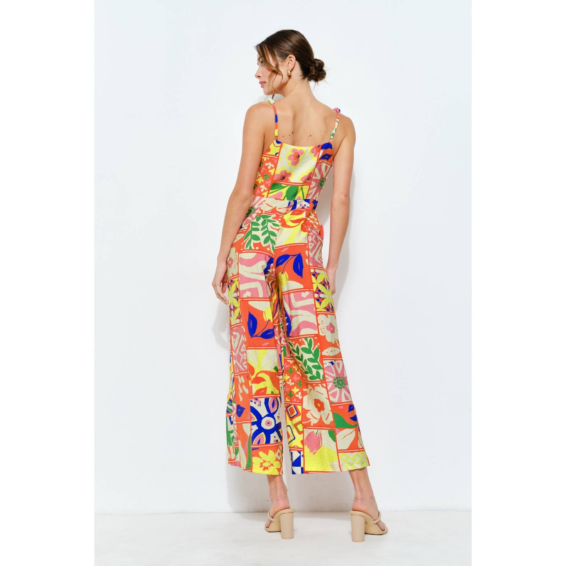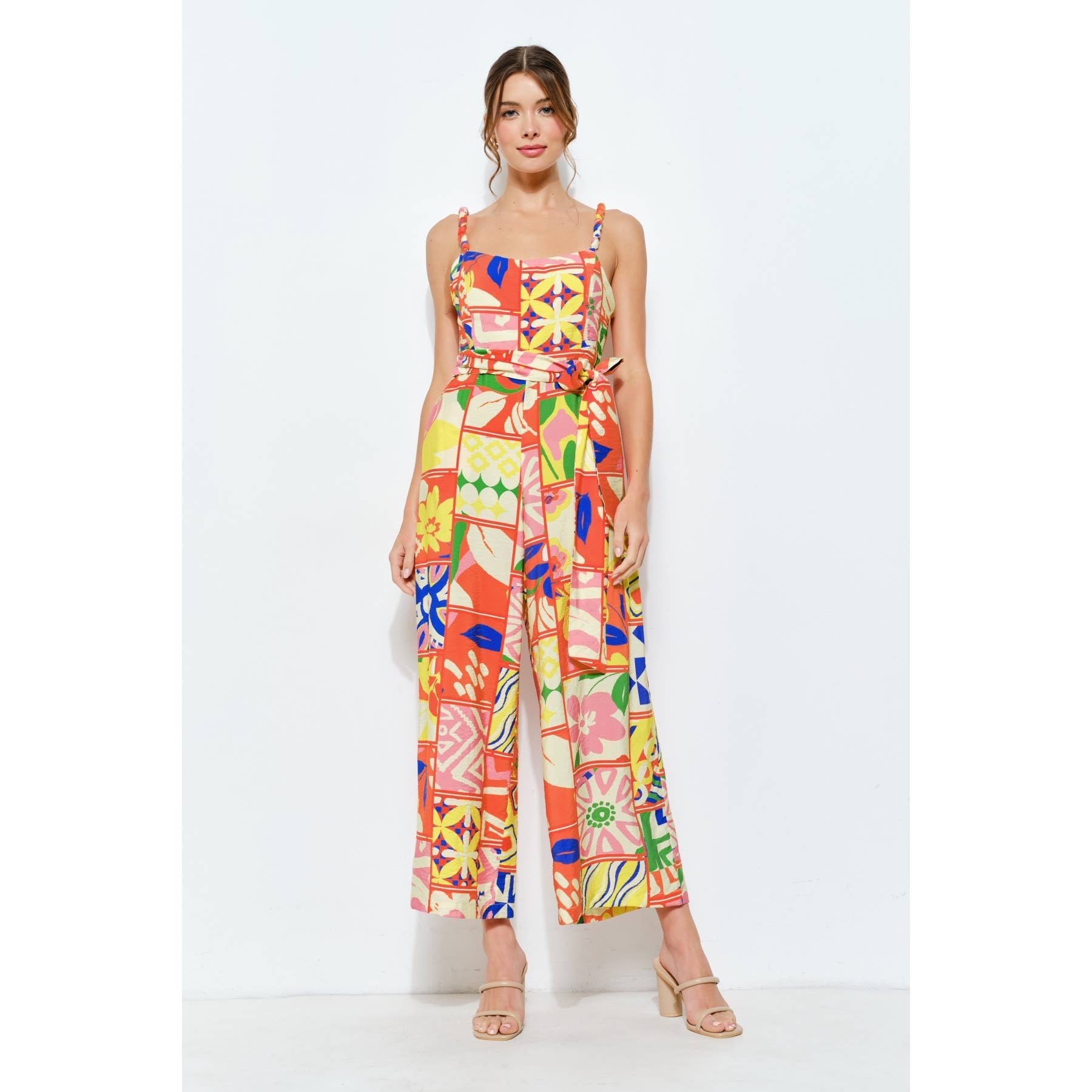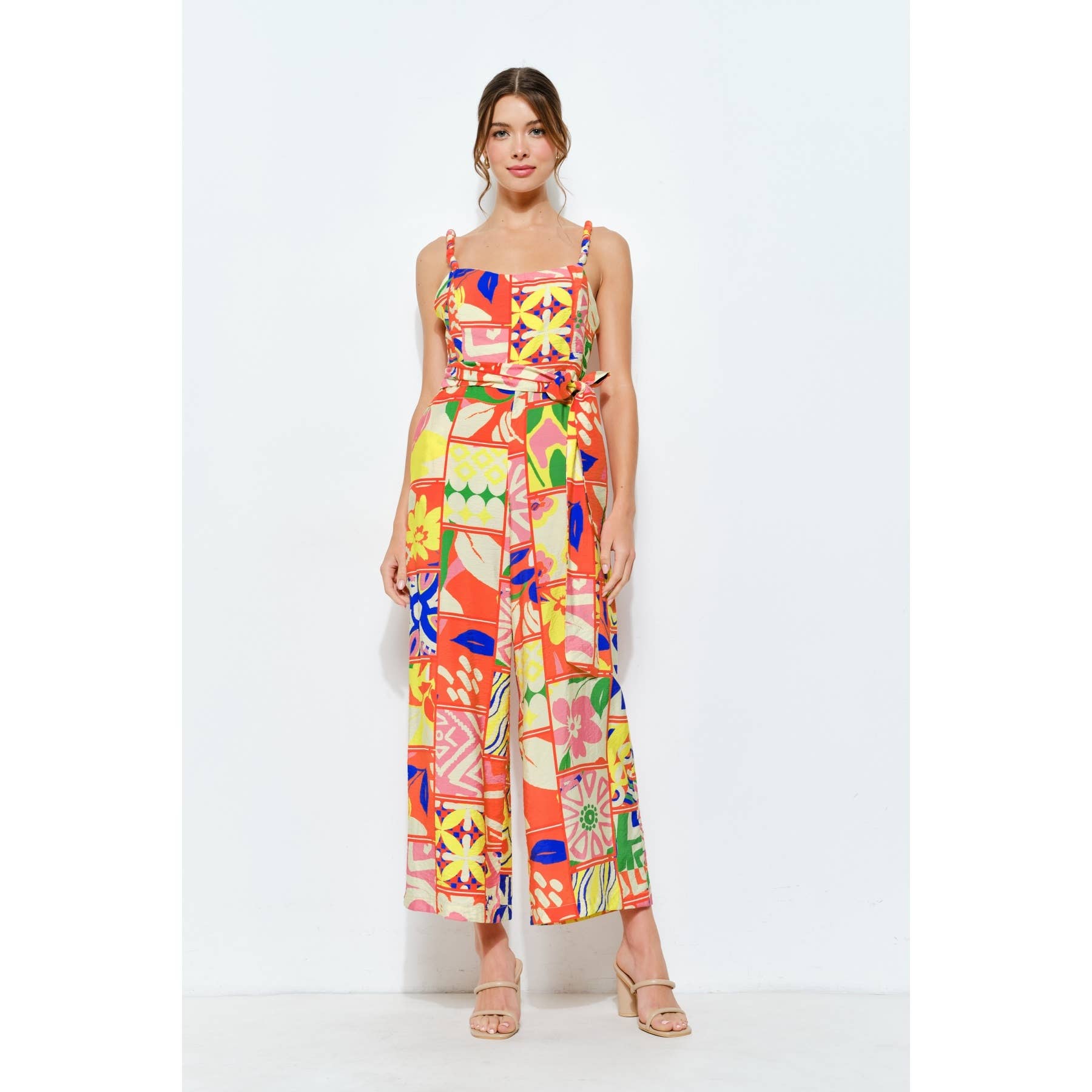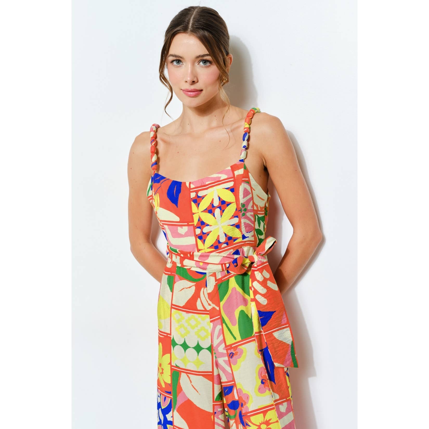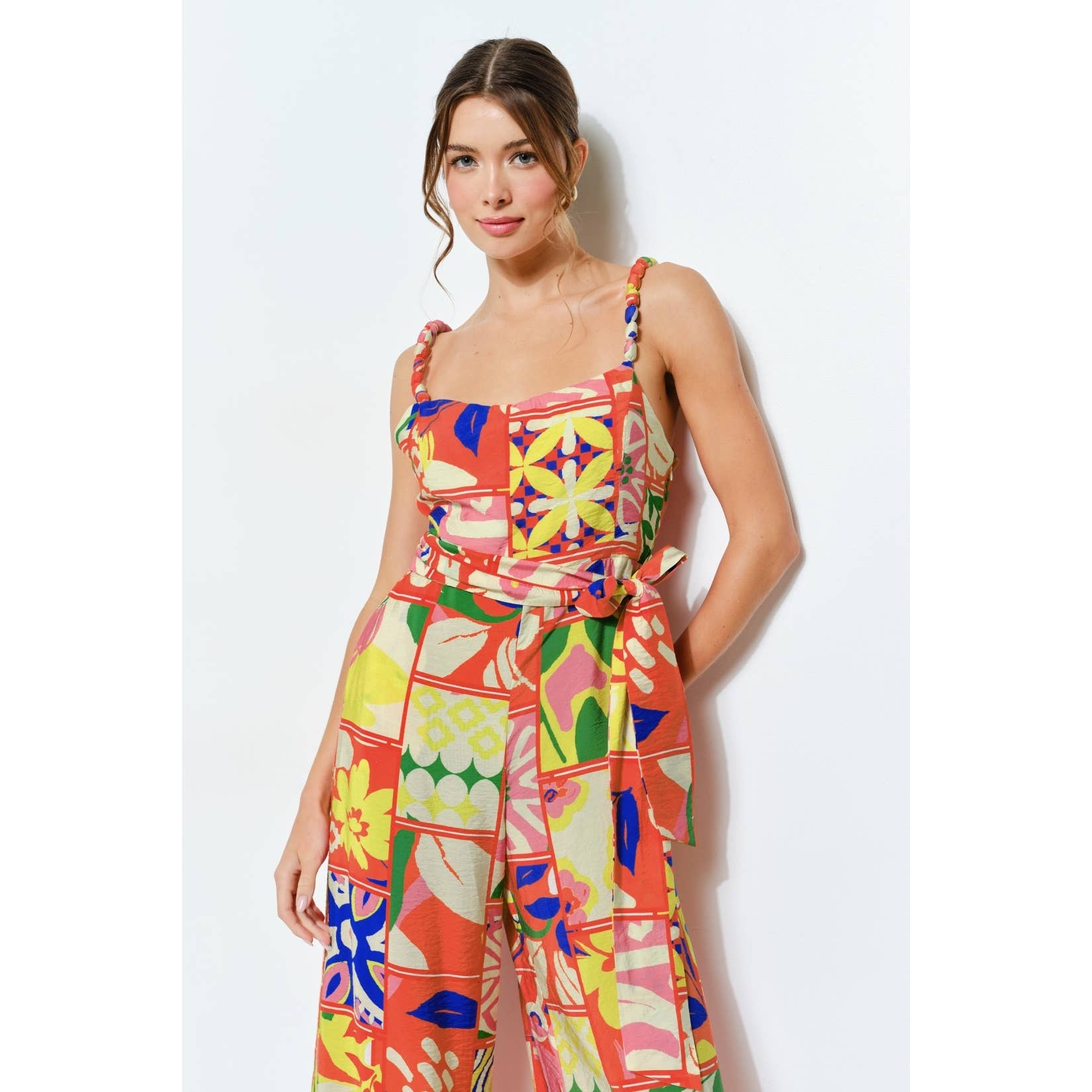 Vibrant Patchwork Wide-Leg Jumpsuit -Square neckline with braided strap details -Colorful patchwork print for a lively, artistic vibe -Flowy wide-leg fit ensuring comfort and elegance -Waist tie for a flattering silhouette -Side pockets add both style and convenience -Perfect for vacations, summer outings, or brunch dates -Hook-and-eye and hidden zip at side